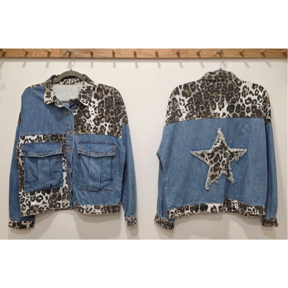 Cazadora vaquera original que combina tejido denim con estampado animal print, creando un diseño moderno y atrevido. Destaca por su mezcla de texturas y por la estrella decorativa en la espalda con el mismo estampado, que le da un toque único ⭐.