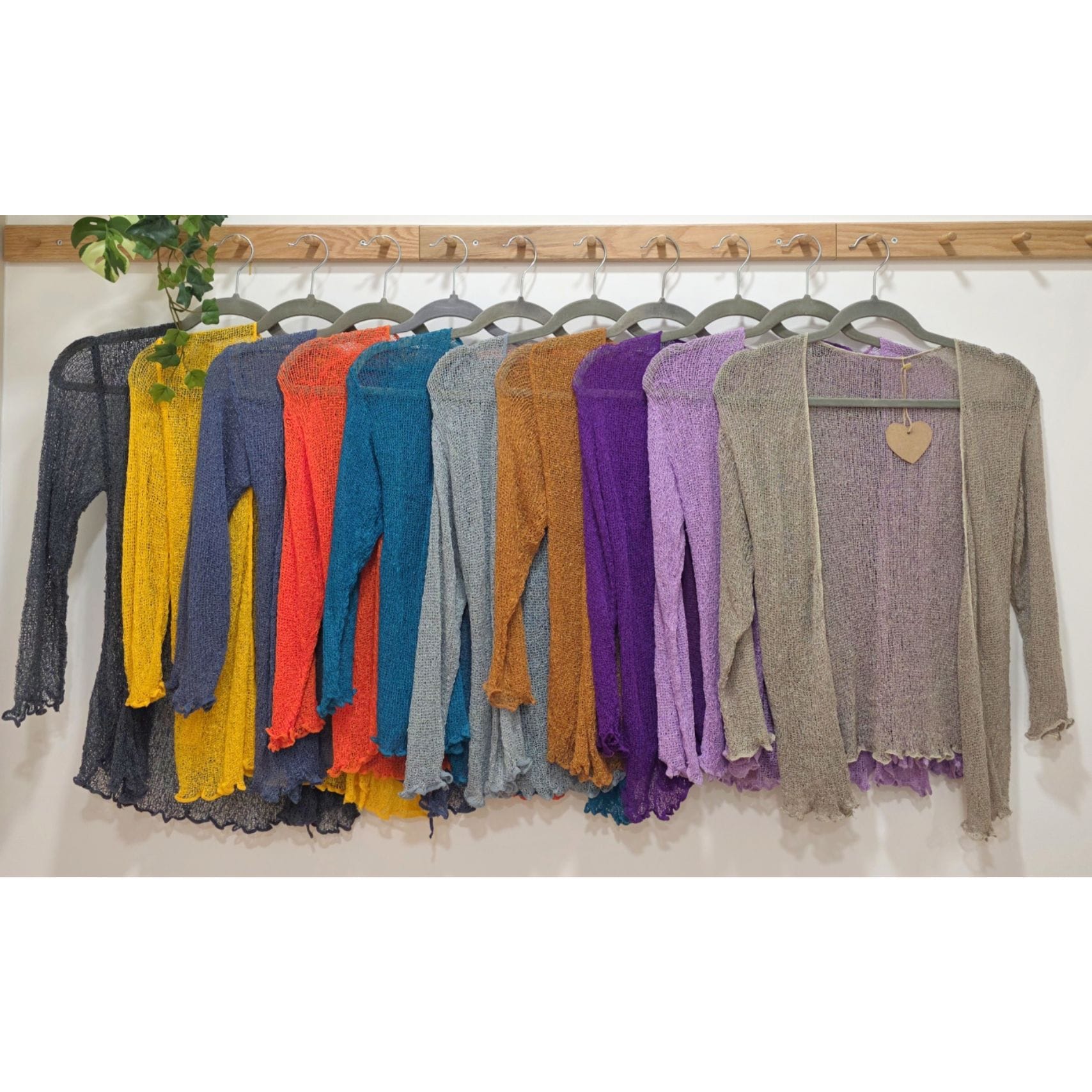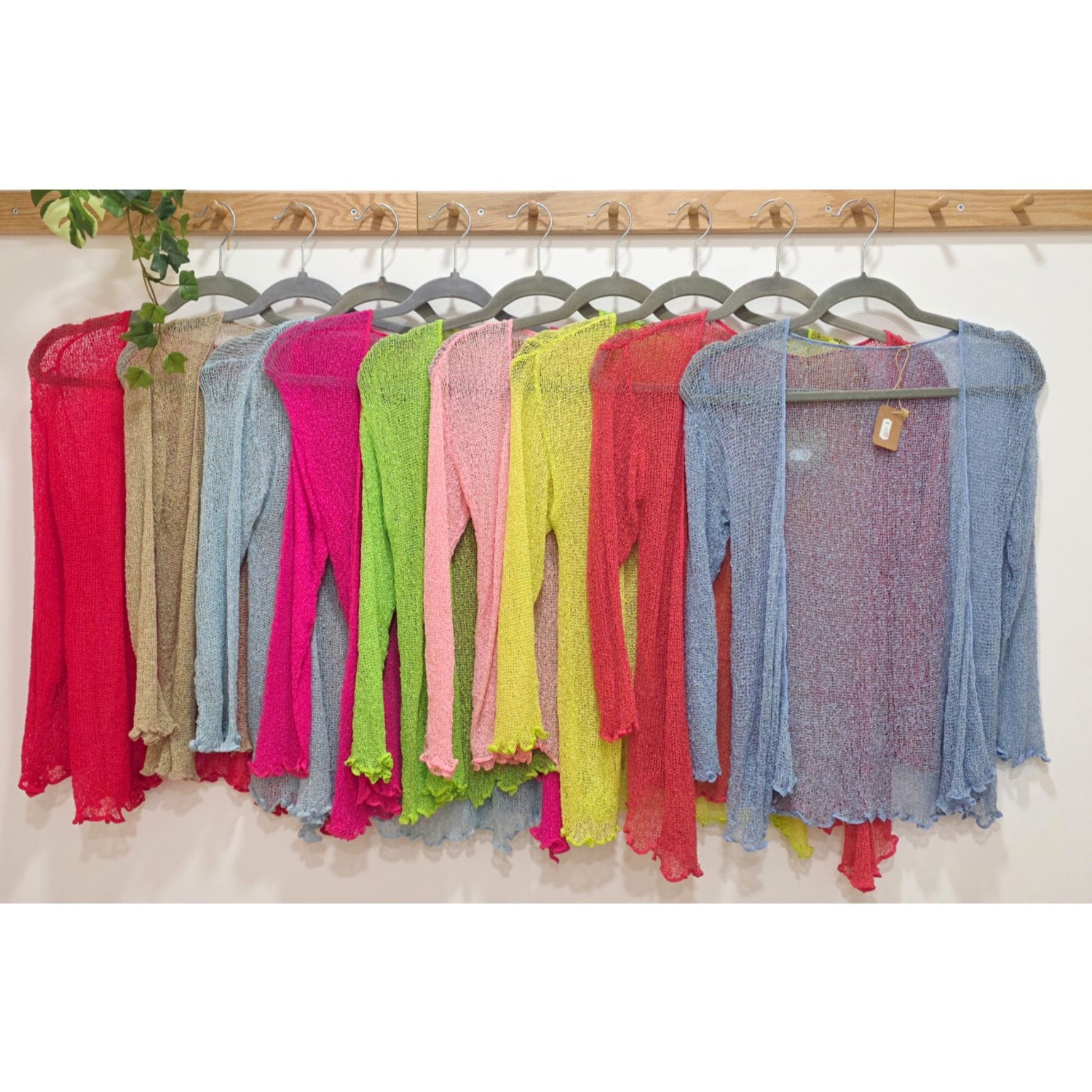 haqueta abierta, de tejido fino y suave, ideal para entretiempo o para dar un toque de color a cualquier look. Su diseño versátil se adapta fácilmente a diferentes tallas gracias a su elasticidad.