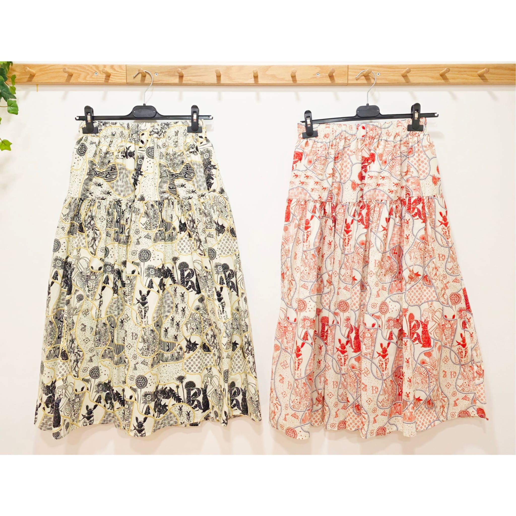 Falda larga con diseño estampado de conejitos, disponible en dos combinaciones de colores: una en tonos beige con detalles en negro y otra en fondo blanco con estampado en rojo. Ambas versiones presentan un estilo llamativo y original, con ilustraciones tipo artístico que le dan un aire único y moderno.