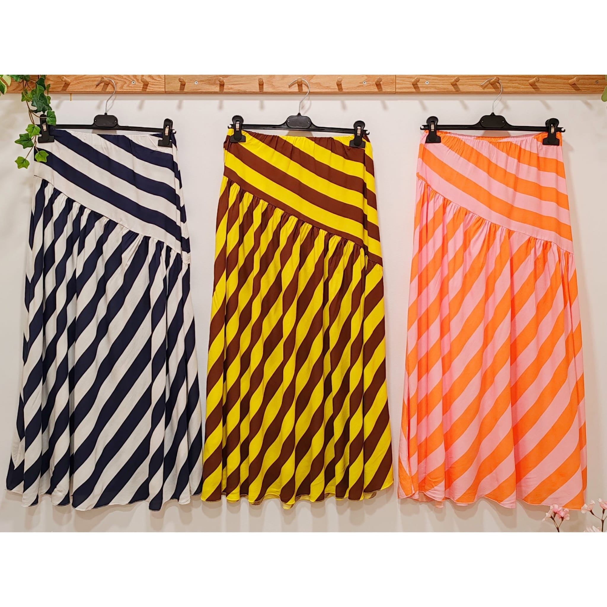Falda de rayas con diseño de rayas asimétricas y caída fluida, ideal para un look fresco y moderno. Confeccionada en viscosa 100%, suave y ligera. Disponible en colores: marino/blanco, rosa/naranja y amarillo/marrón.