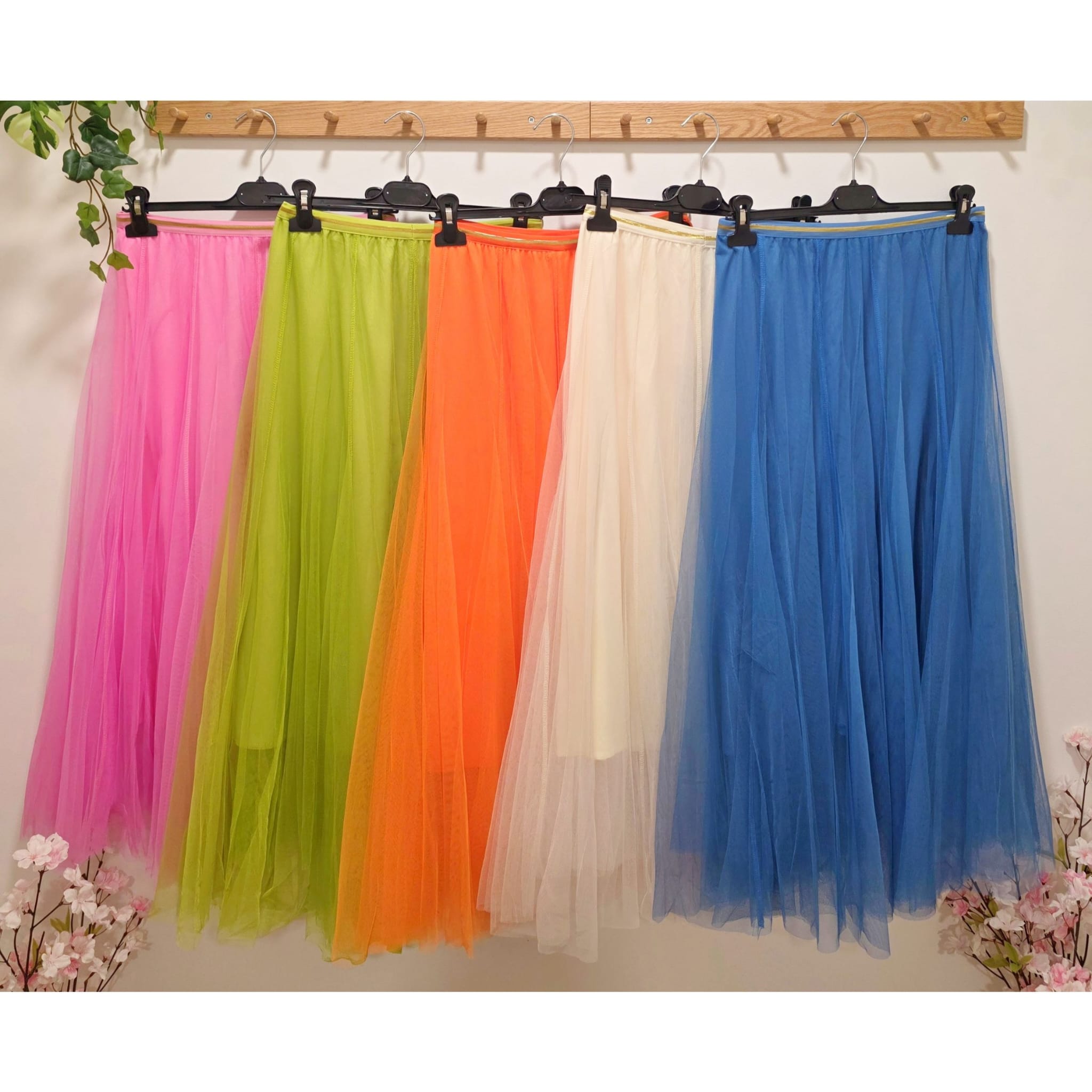 Falda de tul larga y vaporosa, ideal para looks elegantes, eventos especiales o para dar un toque divertido y colorido a cualquier outfit.