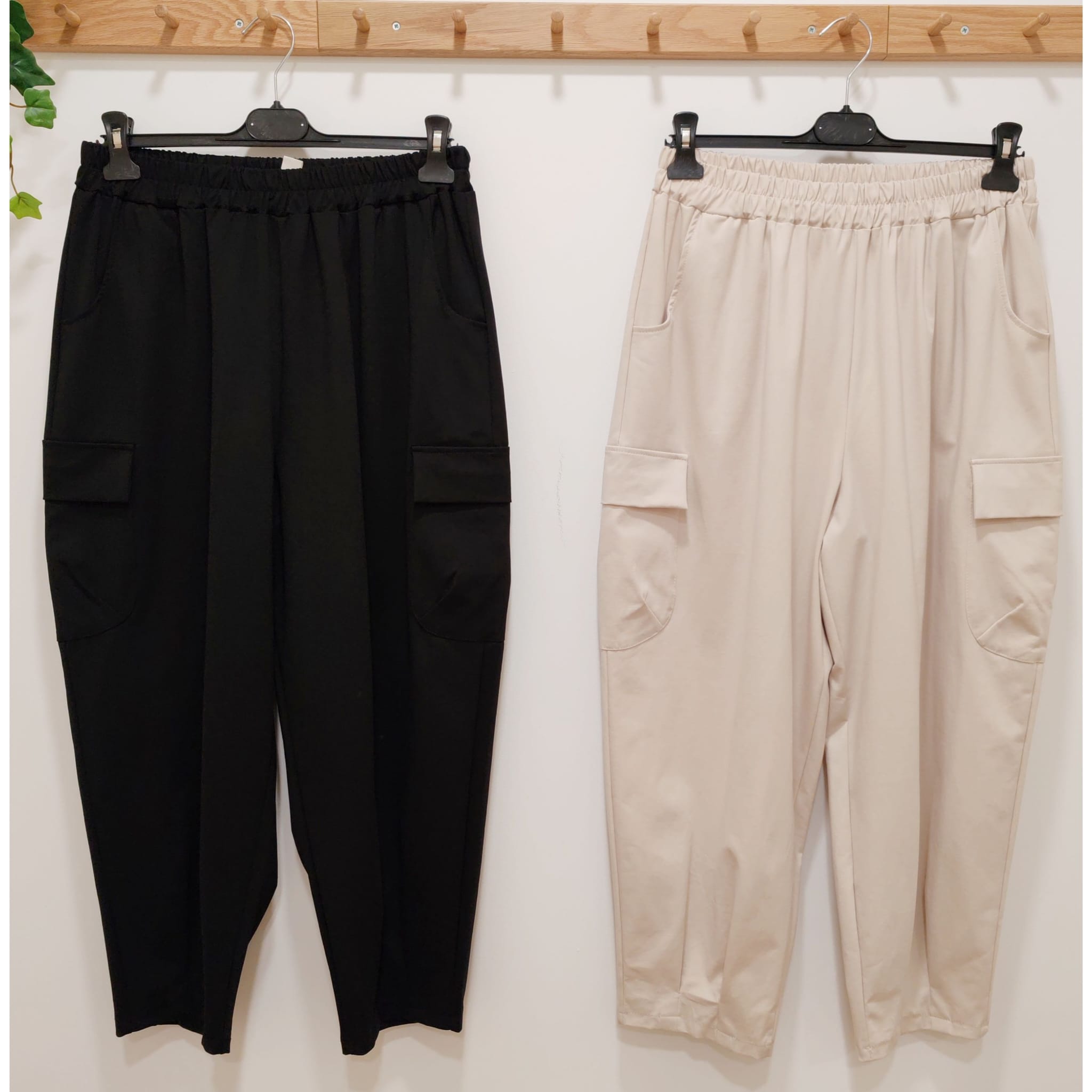 Pantalón cómodo y versátil con diseño moderno y funcional. Cuenta con bolsillos laterales con tapeta, cintura elástica y corte relajado que aporta libertad de movimiento y un estilo casual perfecto para el día a día.