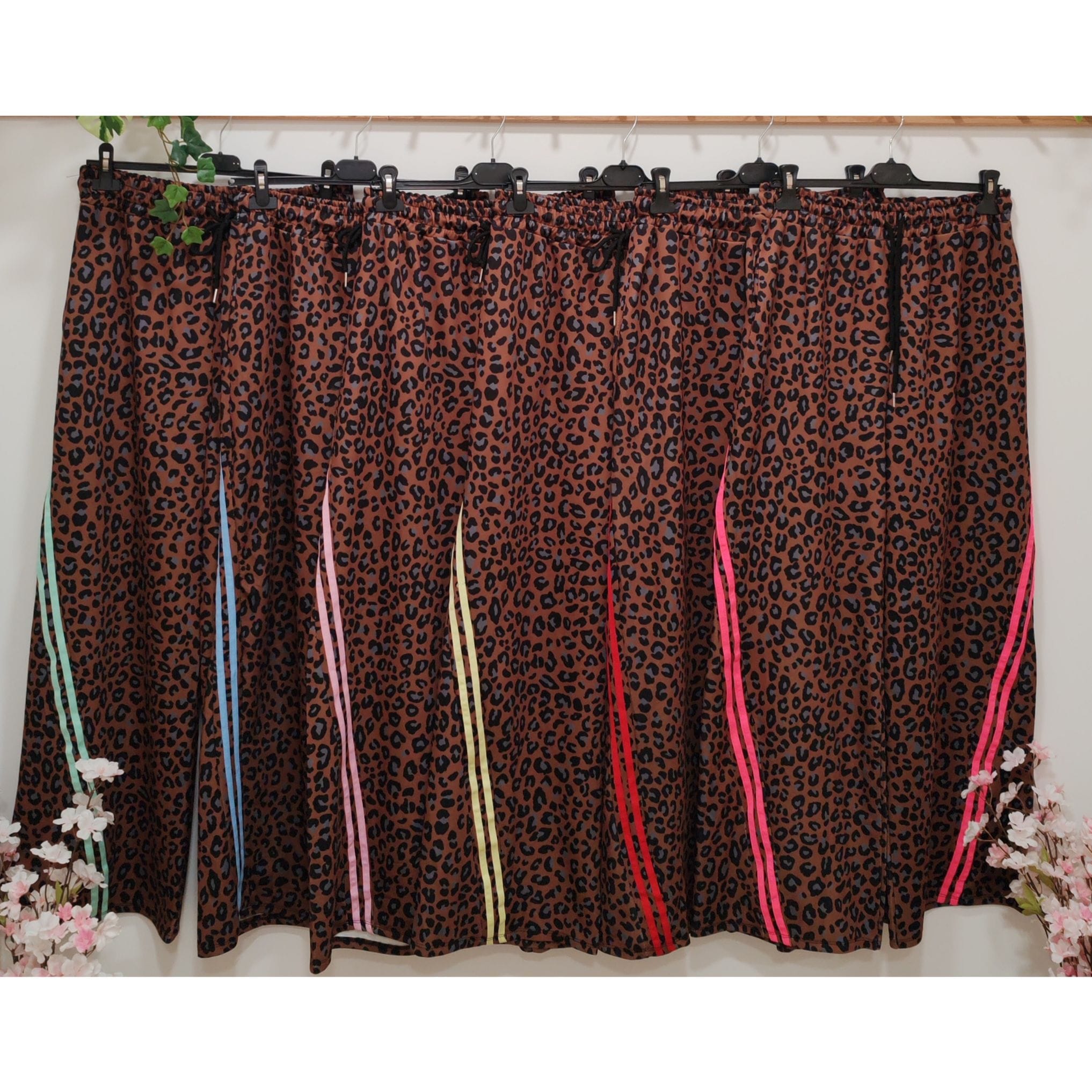Pantalón de estilo casual con estampado animal print en tonos marrón y negro, perfecto para looks cómodos pero con personalidad. Presenta detalle de rayas laterales en colores vibrantes, que aportan un toque moderno y deportivo. Disponible con rayas en verde agua, azul, rosa, amarillo, rojo y fucsia. Cuenta con cintura elástica con cordón ajustable, lo que proporciona mayor comodidad y adaptación al cuerpo.