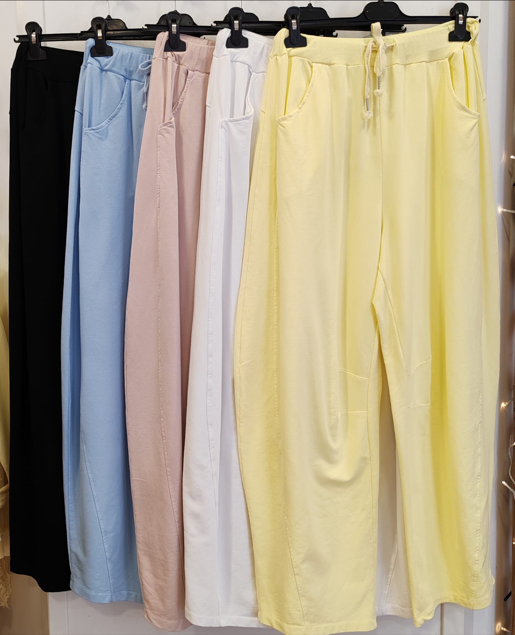 Pantalón largo de estilo cómodo y fluido, confeccionado en tejido suave y elástico que aporta ligereza y confort durante todo el día. Diseño de pernera ancha, con caída recta y bolsillos laterales funcionales. Cintura elástica con cordón ajustable para un mejor ajuste.