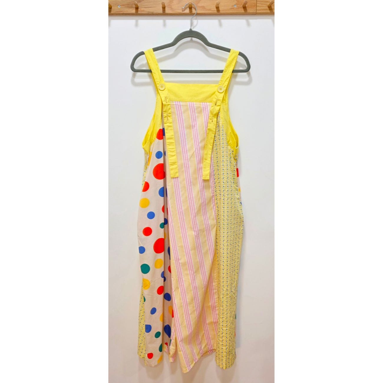 Mono tipo peto largo confeccionado en 100% algodón, ideal para un look cómodo y original. Destaca por su diseño combinado con diferentes estampados: lunares multicolor, rayas verticales en tonos suaves y un delicado patrón pequeño, creando una prenda única y llamativa.